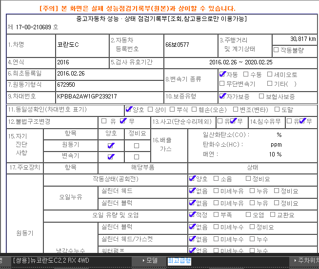 사고유무 :무 ( 단순교환 1곳 ) 성능점검지 참조