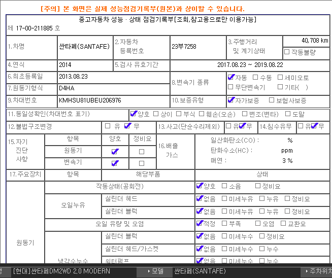 1. 성능점검을 필한 차량으로 보증서 및 점검표교부.