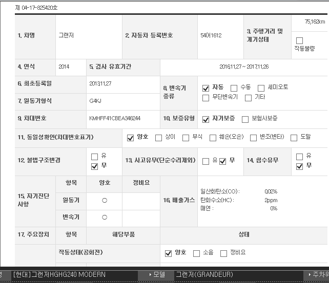 사고유무 :무 ( 완전무사고 ) 성능점검지 참조